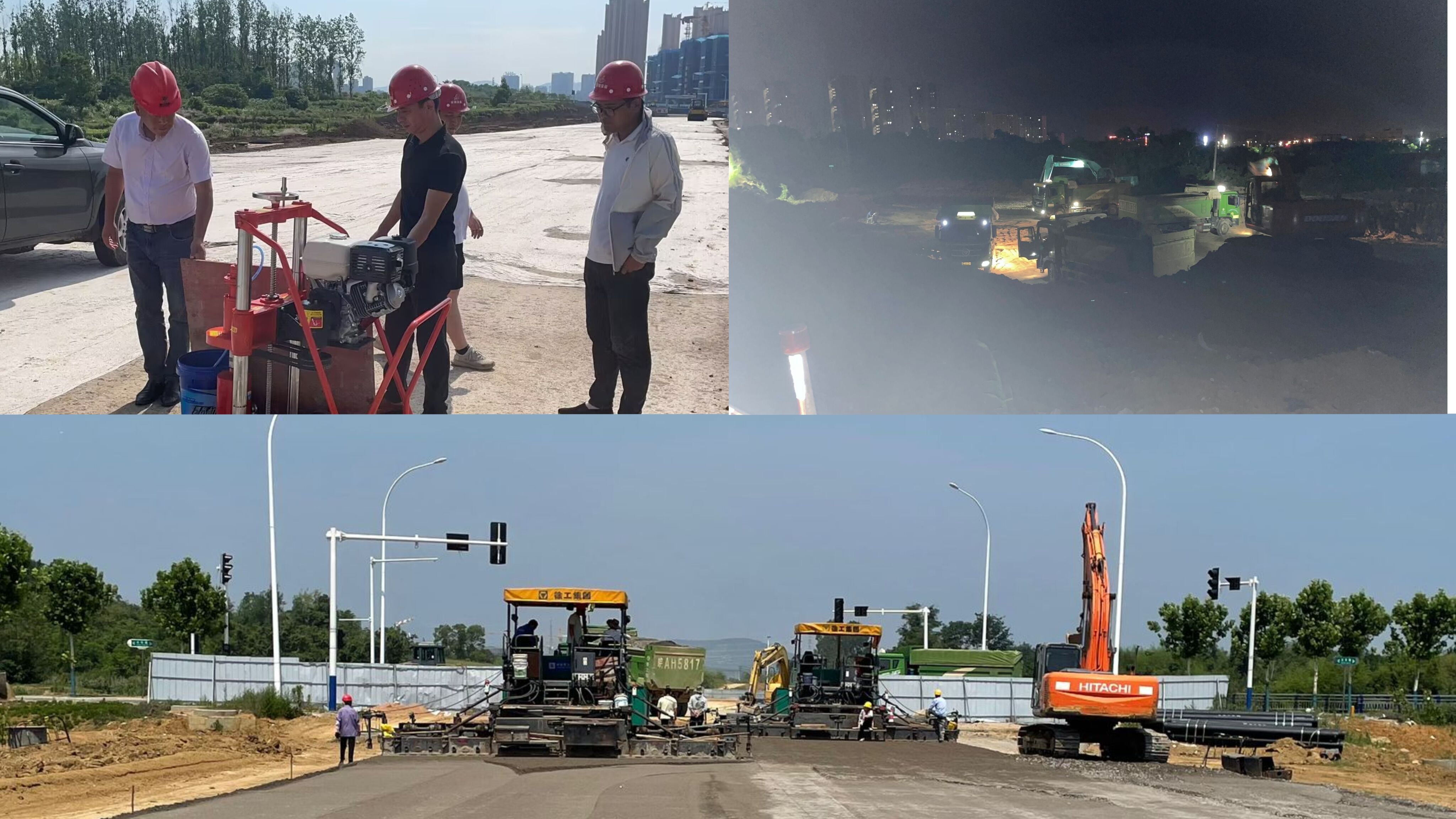 圖為:廬江縣新建立人路(福泉路-城西大道)工程水穩取芯試驗、土方夜間外運及快車(chē)道水溫攤鋪碾壓施工