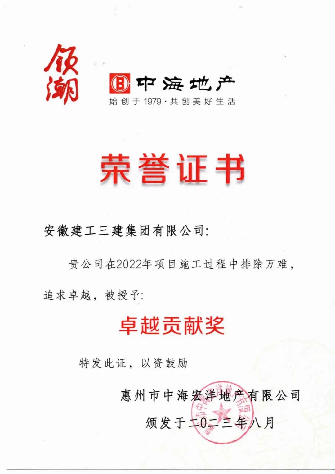 近日,建工三建獲評惠州市中海宏洋地產(chǎn)有限公司“卓越貢獻獎”稱(chēng)號。