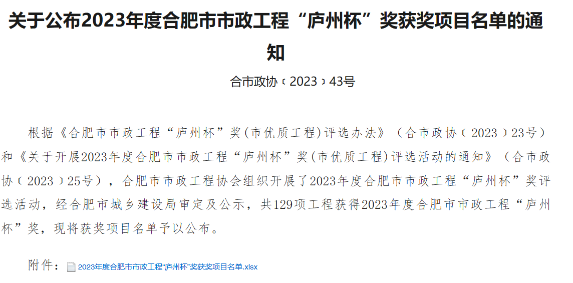近日,2023年度合肥市市政工程“廬州杯”獎已公示完畢,建工交航承建的瑤海區鳳臺路(淮南鐵路-新蚌埠路)道路工程市政項目順利通過(guò)評審,榮獲該獎項。“廬州杯”獎是由合肥市市政工程協(xié)會(huì )組織評審,經(jīng)合肥市城鄉建設局審定,是合肥市市政工程建設領(lǐng)域最高質(zhì)量獎。