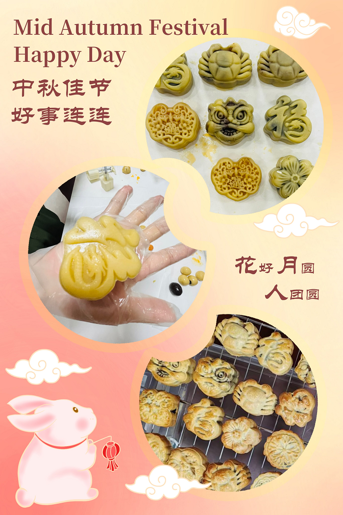 在活動(dòng)現場(chǎng),面點(diǎn)老師為大家簡(jiǎn)單介紹了月餅的起源、種類(lèi)和特點(diǎn),隨后重點(diǎn)介紹了餅皮、餡料、模具等制作材料的用量和制作方式。在聽(tīng)完講解后,大家紛紛躍躍欲試,一邊探討著(zhù)月餅的制作方法,一邊互相傳遞豆沙、鳳梨、山楂等制作月餅的食材。揉面、搟皮、加餡料、包月餅、放入模具按壓成型,一套動(dòng)作行云流水,忙得不亦樂(lè )乎。在輕松愉快的氛圍中,一個(gè)個(gè)色澤鮮艷、小巧玲瓏、造型各異的月餅包好了呈現在每個(gè)人的手中,經(jīng)過(guò)精心烤制后,一盤(pán)盤(pán)美味的月餅在大家的歡聲笑語(yǔ)中出爐了。一口咬下去,軟糯的冰皮,香甜的豆沙,讓人回味無(wú)窮。大家吃著(zhù)自己親手包的月餅,甜在口中,更甜在心里,把包好的月餅帶回家,將甜蜜與家人一起分享。