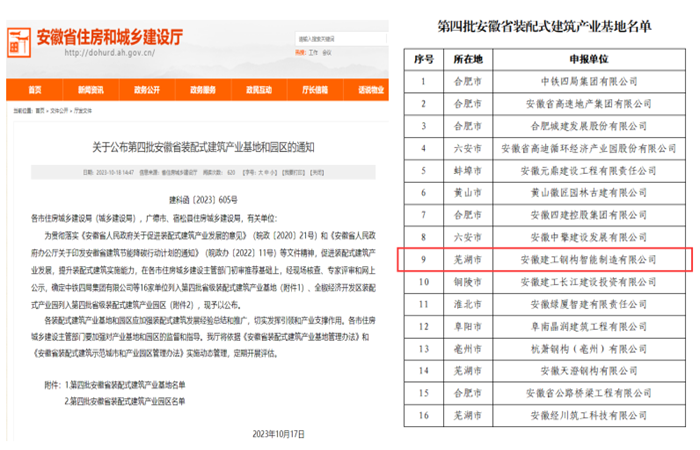 10月18日,安徽省住房和城鄉建設廳發(fā)布《關(guān)于公布第四批安徽省裝配式建筑產(chǎn)業(yè)基地和園區的通知》,安徽建工鋼構智能制造有限公司成功入選。