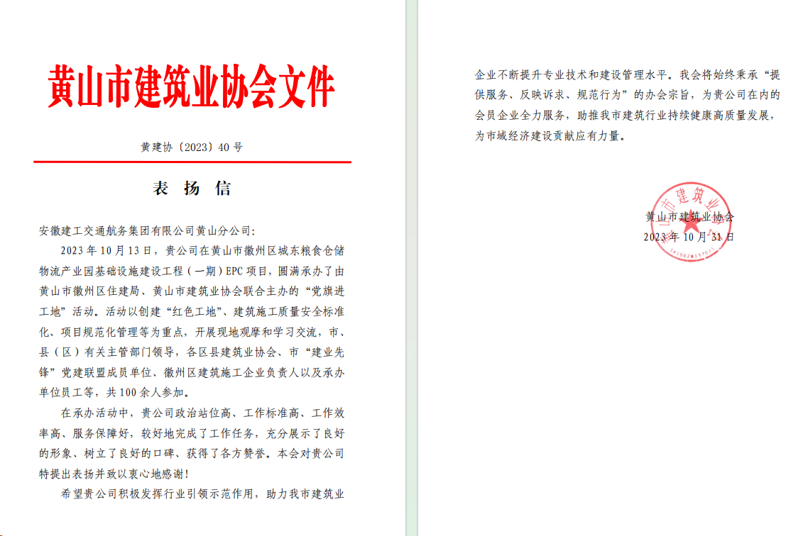 10月31日,建工交航黃山分公司收到黃山市建筑業(yè)協(xié)會(huì )發(fā)來(lái)的表?yè)P信。信中對黃山分公司在所屬徽州區城東糧食倉儲物流園項目圓滿(mǎn)承辦“黨旗進(jìn)工地”活動(dòng)予以充分肯定。