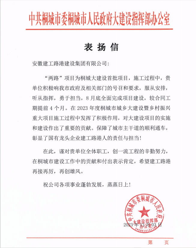近日,建工路港桐城市城鄉建設暨鄉村振興重大項目部收到桐城市人民政府大建設指揮部表?yè)P信,信中對桐城大建設“兩路”項目所取得的成績(jì)提出表?yè)P。