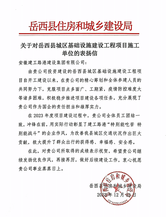 近日,岳西縣城區基礎設施建設項目收到岳西縣住房和城鄉建設局的表?yè)P信。