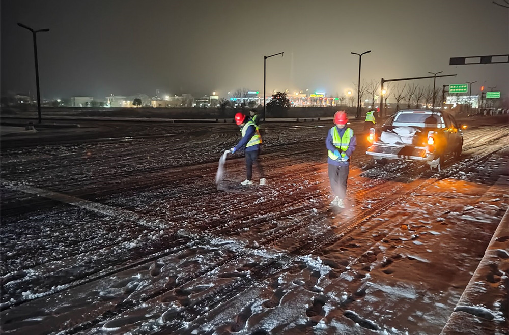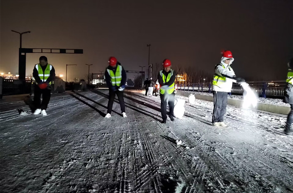 面對寒潮降雪天氣,項目部“以雪為令”,迅速啟動(dòng)惡劣天氣應急預案,全面開(kāi)展除積雪工作,全力為群眾出行安全、道路暢通保駕護航。通過(guò)科學(xué)分工,明確任務(wù),管理人員對施工現場(chǎng)、生活區、辦公區等進(jìn)行了全方位檢查,尤其是對施工區的鋼筋大棚以及各平交路口等重點(diǎn)部位進(jìn)行了詳細的安全排查。項目員工在施工道路改三橋(K8天橋、金梅路跨206天橋、K12天橋)進(jìn)行了撒鹽解凍和積雪鏟除等工作,在重點(diǎn)路段加強巡邏管控,引導車(chē)輛減速慢行,確保道路總體通暢。