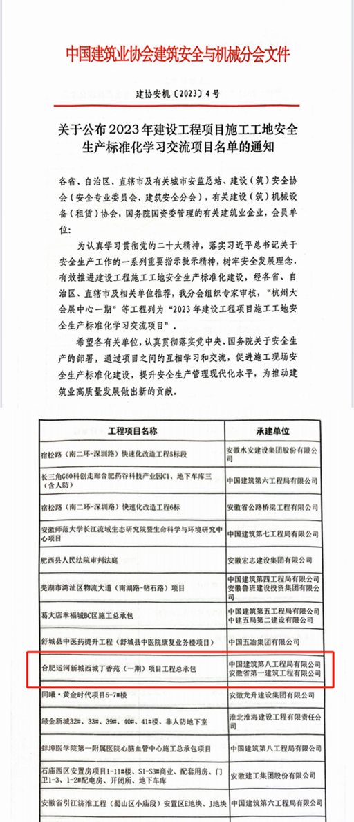 近日,中國建筑業(yè)協(xié)會(huì )建筑安全與機械分會(huì )公布了2023年建設工程項目施工工地安全生產(chǎn)標準化學(xué)習交流項目名單,建工一建丁香苑項目位列其中,被授予“2023年建設工程項目施工工地安全生產(chǎn)標準化學(xué)習交流項目”稱(chēng)號。