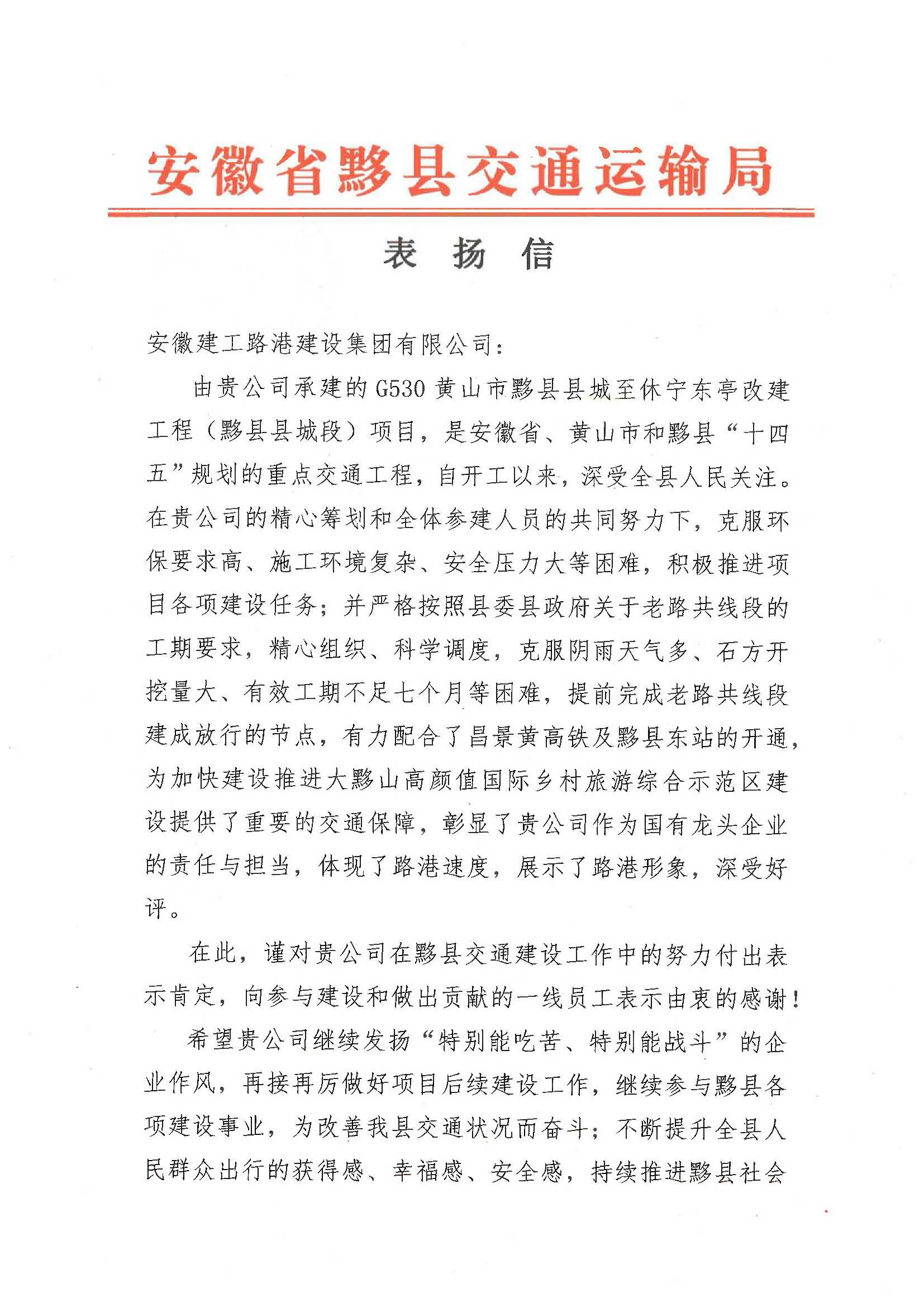 近日,建工路港G530黃山市黟縣縣城至休寧東亭改建項目收到黟縣交通運輸局的表?yè)P信。