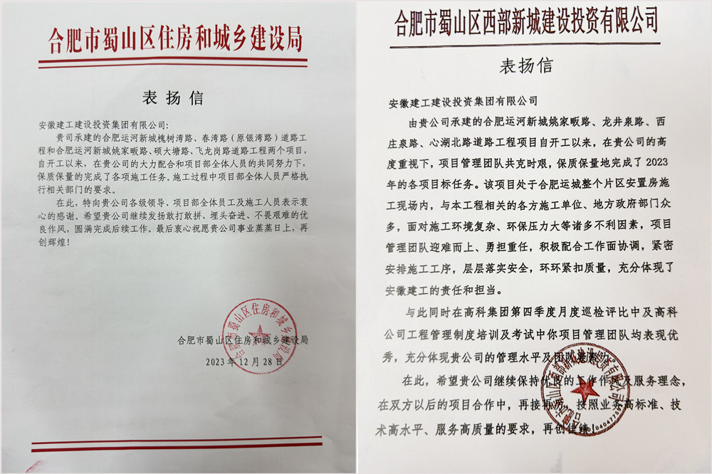 近日,建工建投集團合肥運河新城片區項目同時(shí)收到合肥市蜀山區住房和城鄉建設局、合肥市蜀山區西部新城建設投資有限公司發(fā)來(lái)的兩封表?yè)P信。信中對公司承建的合肥運河新城槐樹(shù)灣路、春灣路(原銀灣路)道路工程項目、合肥運河新城姚家畈路、碩大塘路、飛龍崗路道路工程項目和合肥運河新城姚家畈路、龍井泉路、西莊泉路、心湖北路道路工程項目給予了充分的認可。