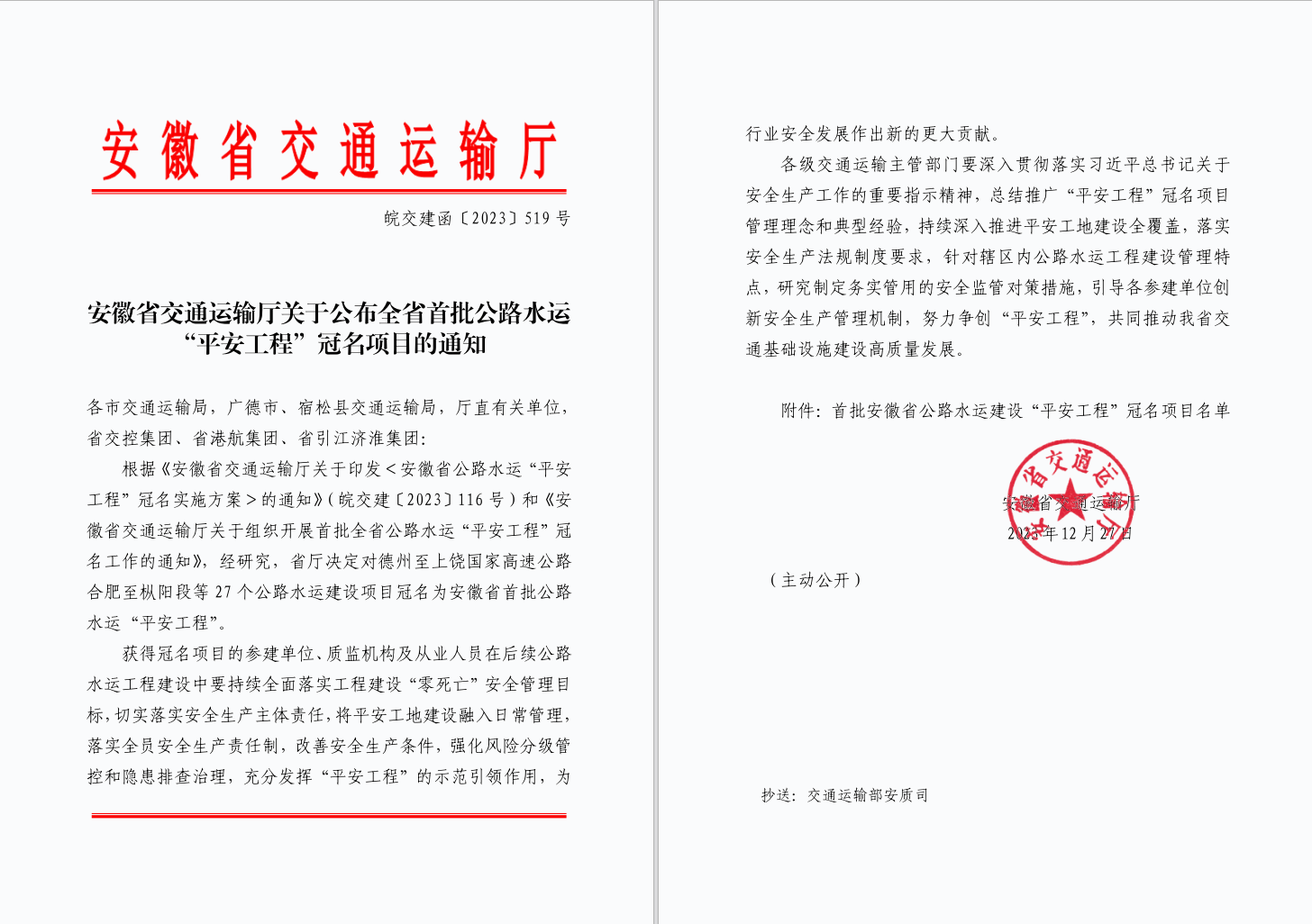 近日,安徽省交通廳公示了安徽省首批公路水運“平安工程”冠名項目名單,建工路港承建的G5011蕪合高速公路蕪湖至林頭段改擴建工程01標、北沿江高速公路滁州至天長(cháng)段預制標、明光至巢湖高速公路合肥段、亞洲開(kāi)發(fā)銀行貸款安徽綜合交通基礎設施項目水陽(yáng)江航道整治工程疏浚標段和S244羅崗至分路口段公路工程01標等5個(gè)項目榮獲安徽省首批公路水運“平安工程”冠名。