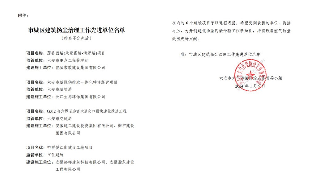 1月12日,G312合六界至迎賓大道交口段快速化改造工程項目部收到六安市大氣污染防治工作領(lǐng)導小組的通報表?yè)P文件。因G312合六界至迎賓大道交口段快速化改造工程項目在深入打好六安市藍天保衛戰深度治理各類(lèi)建筑揚塵工作中做出了顯著(zhù)成績(jì),喜獲通報表?yè)P。