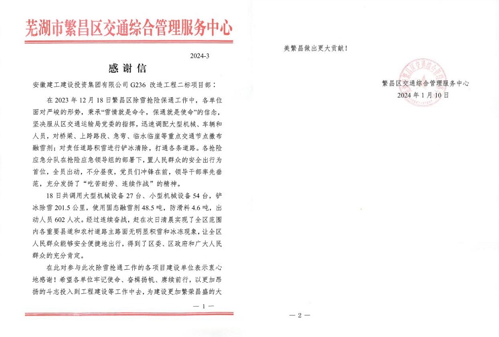 信中指出,在2023年12月18日繁昌區除雪搶險保通工作中,項目部面對嚴峻的形勢,秉承“雪情就是命令,保通就是使命”的信念,迅速調配大型機械、車(chē)輛和人員,統一部署,多措并舉,黨員們沖鋒在前,領(lǐng)導干部率先垂范,經(jīng)過(guò)連續奮戰,在次日清晨實(shí)現了全區范圍內各重要縣道和農村道路主路面無(wú)明顯積雪和冰凍現象,得到了區委、區政府和廣大人民群眾的充分肯定。