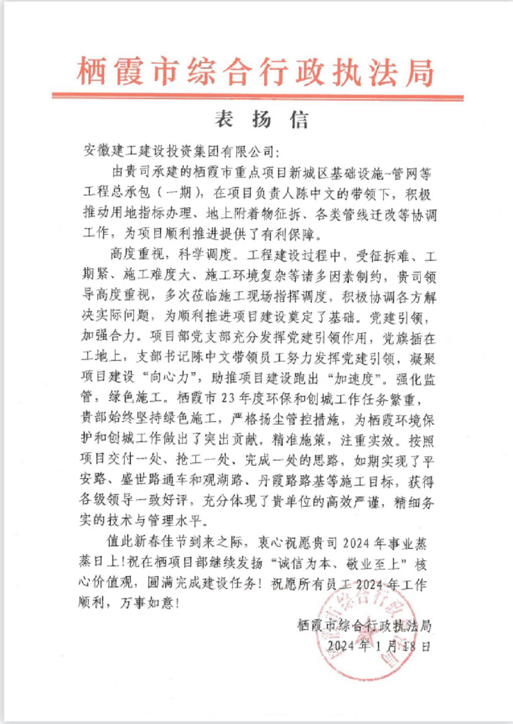 1月18日,建工建投集團棲霞市新城區基礎設施管網(wǎng)項目收到棲霞市綜合行政執法局發(fā)來(lái)的表?yè)P信,信中對項目管理團隊的工作予以充分肯定和表?yè)P,對建工建投集團的大力支持表示誠摯感謝。