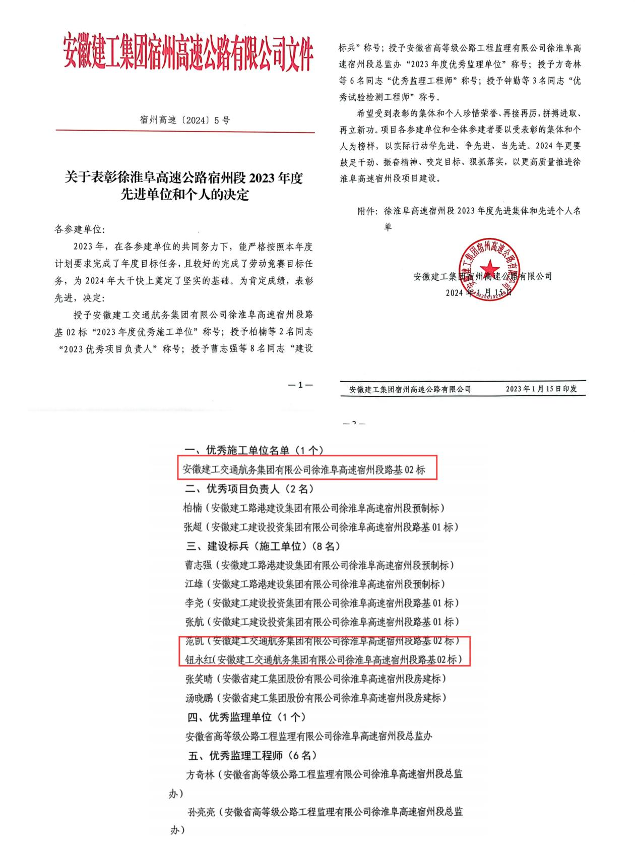 近期,安徽建工集團宿州高速公路有限公司召開(kāi)了2023年度總結暨2024年工作部署會(huì ),表彰2023年徐淮阜高速公路宿州段先進(jìn)單位和先進(jìn)個(gè)人。建工交航徐淮阜高速宿州段路基工程02標項目表現優(yōu)異,各項工作推進(jìn)有力,產(chǎn)值進(jìn)度超前完成,在年度綜合評比中取得第一名,榮獲了“2023年度優(yōu)秀施工單位”“2023年度勞動(dòng)競賽第一名”和2名“建設標兵”榮譽(yù)稱(chēng)號。