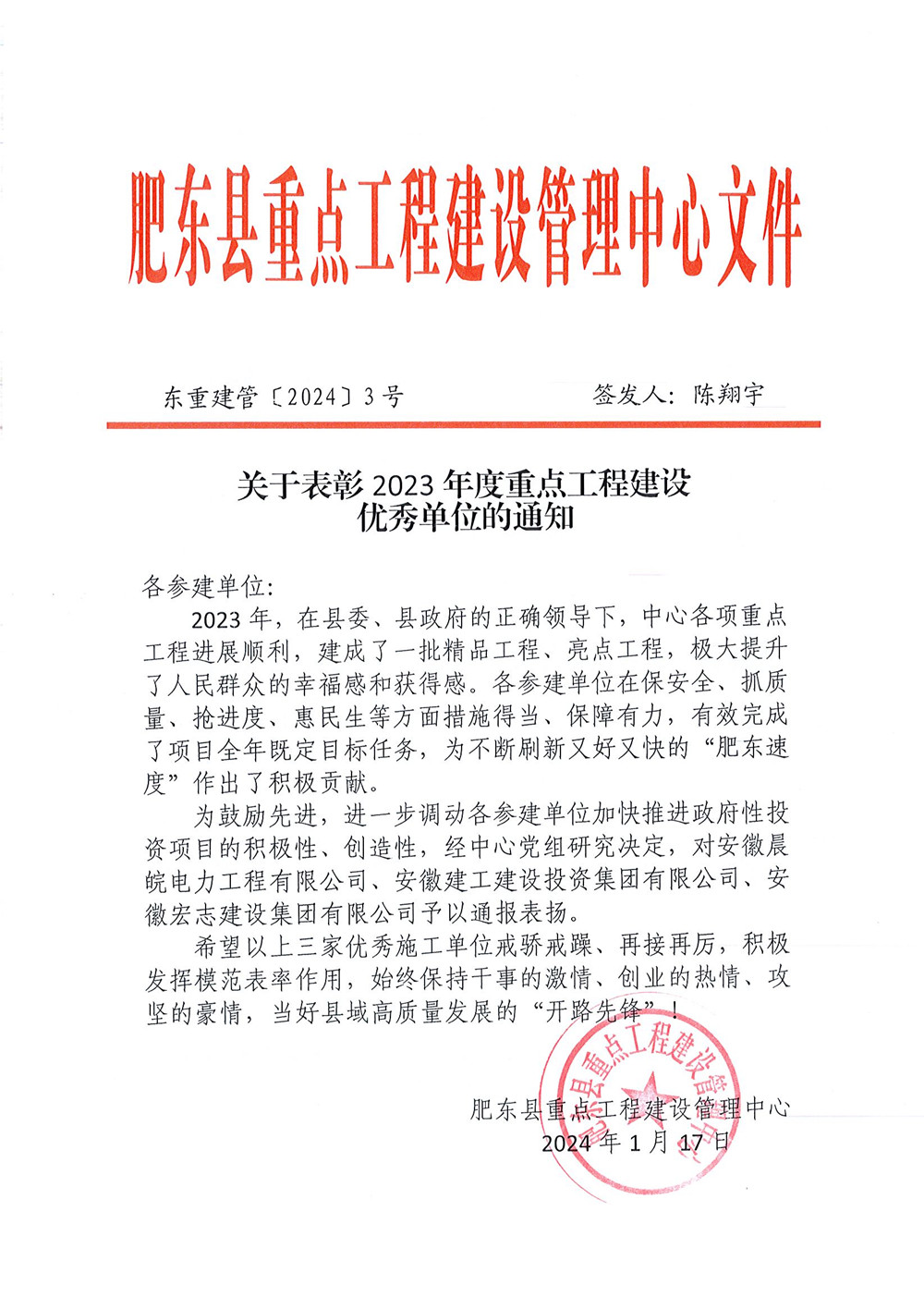 表?yè)P信中指出,建工建投集團在保安全、抓質(zhì)量、搶進(jìn)度、惠民生等方面措施得當、保障有力,有效完成了項目全年既定目標任務(wù),為不斷刷新又好又快的“肥東速度”作出了積極貢獻。