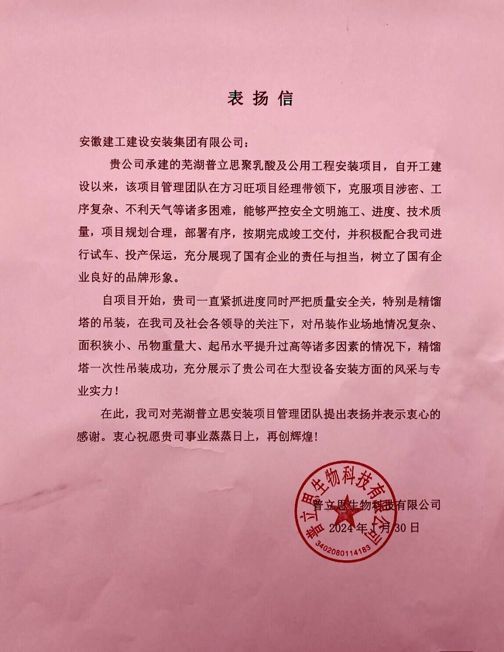 近日,建工安裝蕪湖普立思聚乳酸及公用工程安裝項目收到業(yè)主表?yè)P信,對項目團隊在項目建設過(guò)程中主動(dòng)作為、攻堅克難,敢于擔當、全力拼搏的精神予以充分肯定和高度認可,對公司及項目全體參建人員的辛苦付出和不懈努力表示衷心感謝和誠摯問(wèn)候。