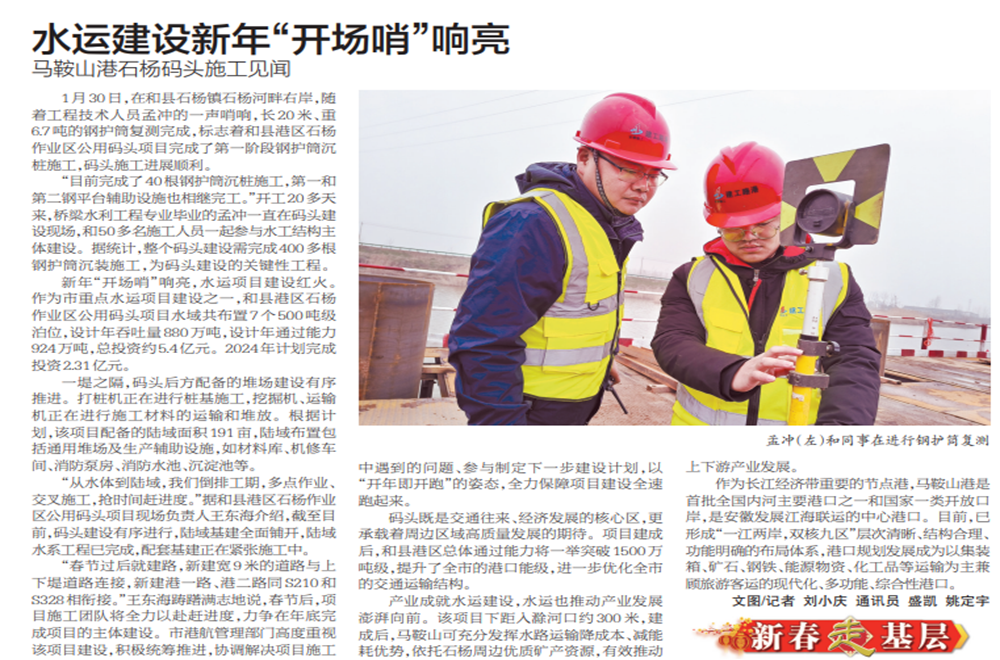 2月1日,皖江晚報記者新春走基層來(lái)到安徽建工馬鞍山港石楊碼頭,以《水運建設新年“開(kāi)場(chǎng)哨”響亮——馬鞍山港石楊碼頭施工見(jiàn)聞》為題對項目建設進(jìn)行關(guān)注報道。