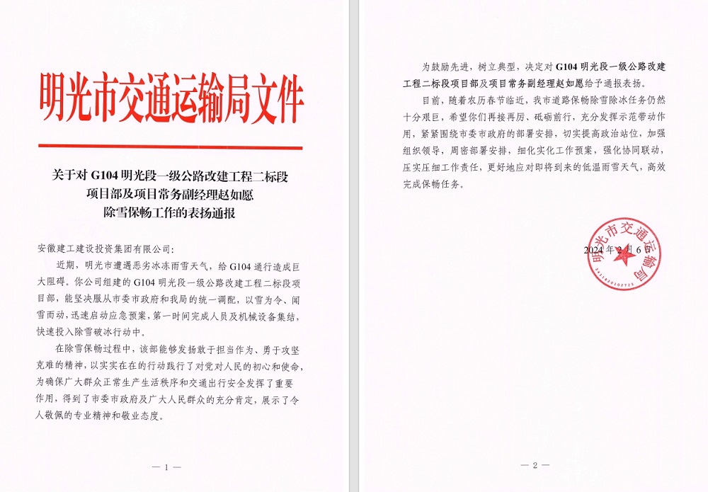 J2月6日,建工建投集團G104明光段一級公路改建工程二標段項目部收到明光市交通運輸局發(fā)來(lái)的表?yè)P信,信中對項目部在這次除雪保暢的工作予以充分肯定和表?yè)P。