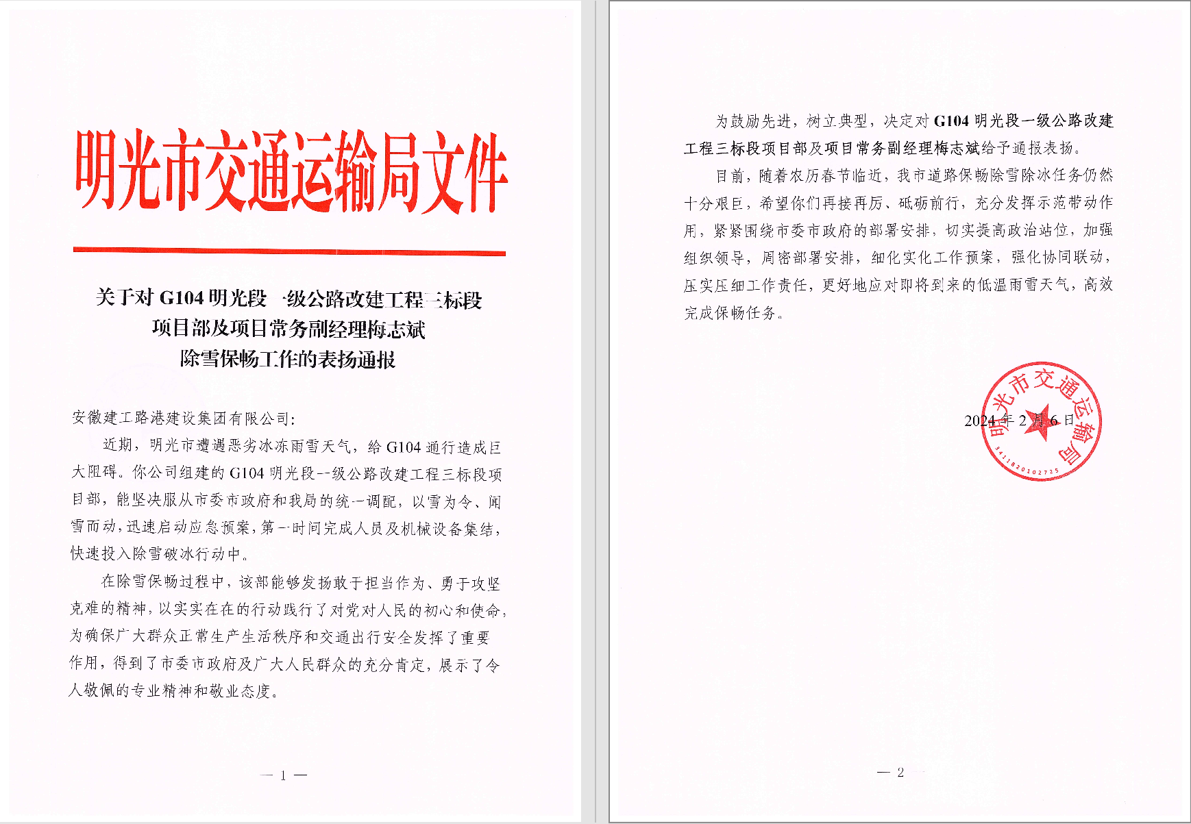 信中指出,連日的大雪天氣,G104三標全體人員迎風(fēng)雪,戰嚴寒,積極投入到除雪保暢的行動(dòng)中,保障了長(cháng)三角春節返程 G104明光段公路的暢通無(wú)阻,得到了明光市委市政府及廣大人民群眾的充分肯定。