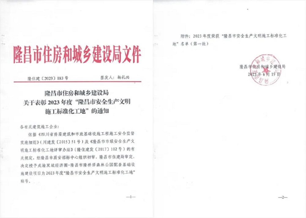 成渝雙城經(jīng)濟圈隆昌市隆橋驛森林公園配套基礎設施建設項榮獲2023年度“安全生產(chǎn)文明施工標準化工地”