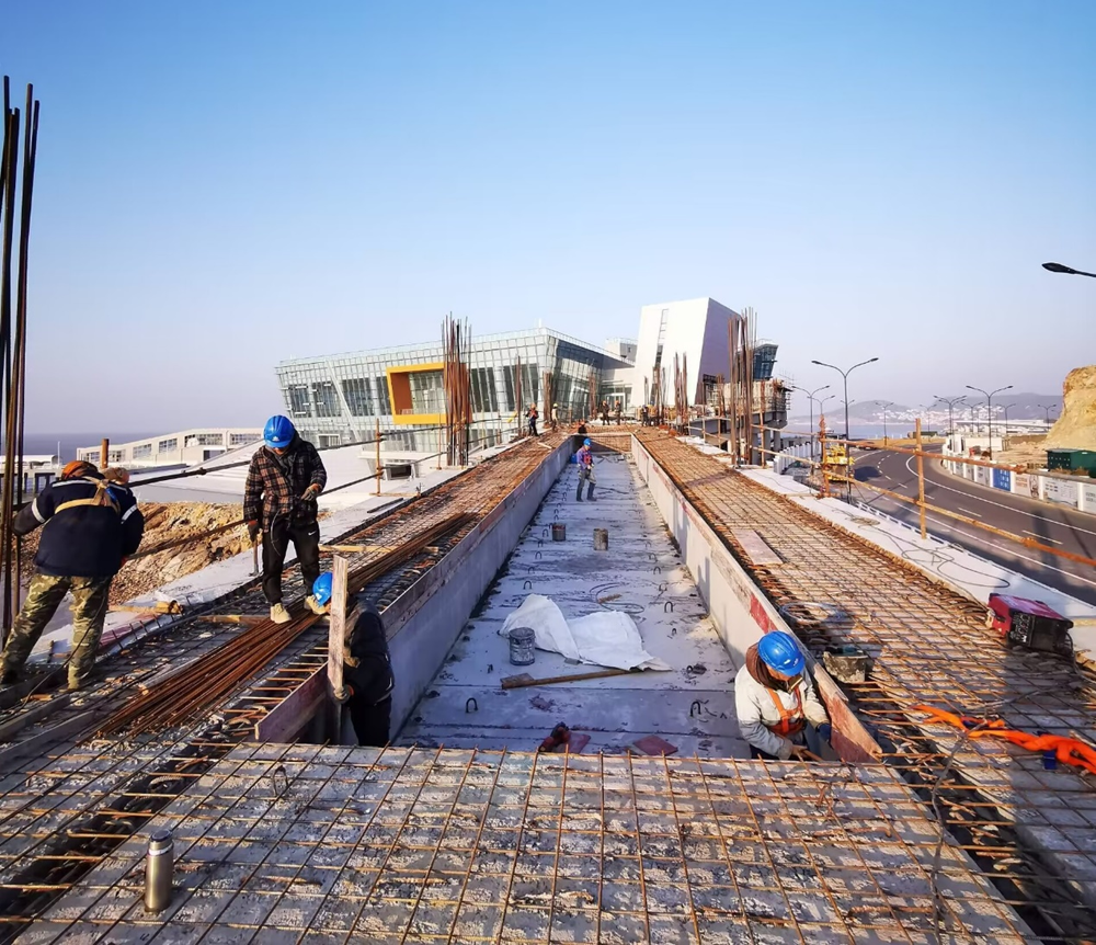 嵊泗PPP項目旅游交通集散中心登船連廊施工,及時(shí)進(jìn)行橋梁上部房建結構支架搭設與模板安裝工作。