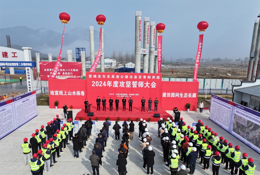 3月8日上午,由涇青高速項目公司組織的2024年度攻堅誓師大會(huì )成功召開(kāi),大會(huì )由涇縣交通局局長(cháng)曹建華主持,涇縣縣委縣政府、涇縣交通局、黃村鎮政府以及各參建單位有關(guān)人員參加誓師大會(huì )。