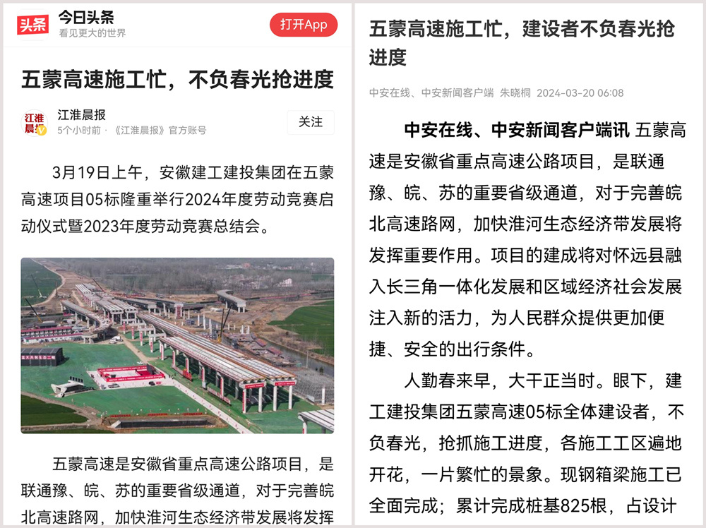 媒體聚焦‖中安在線(xiàn)、《江淮晨報》報道建工建投集團五蒙高速建設者不負春光大干正酣