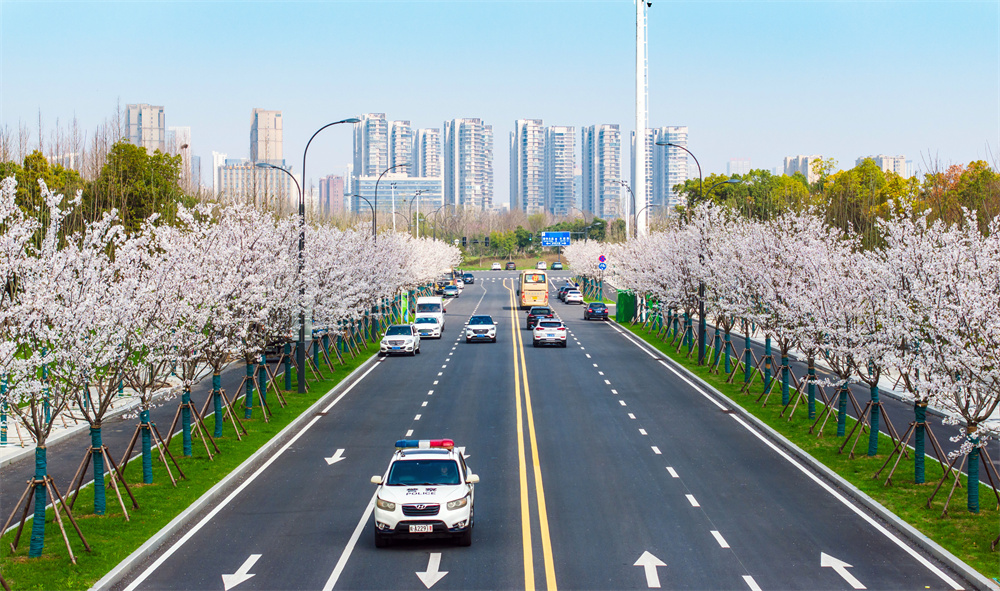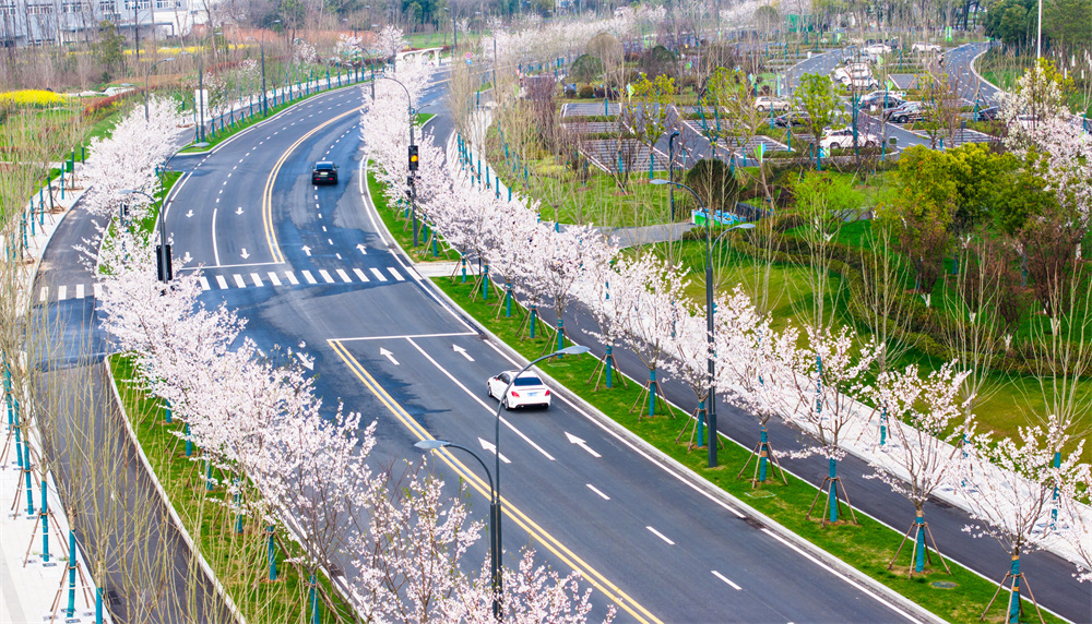 作為通往園博園的重要通道,青海路在景觀(guān)設計上與公園景觀(guān)高度融合,尤其是青海路(廬州大道-西寧路)段,全長(cháng)1.3公里,兩側共計栽植318株染井吉野櫻花,是名副其實(shí)的“櫻花大道”。