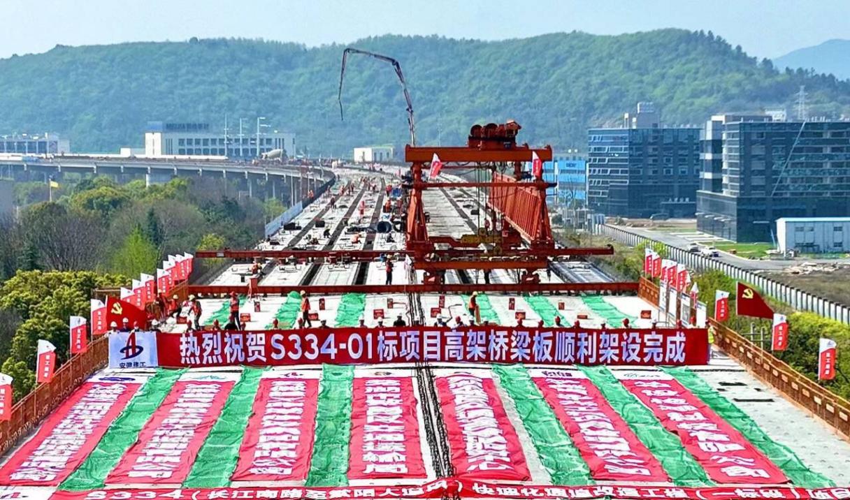 經(jīng)過(guò)300多個(gè)日日夜夜的艱苦奮斗,4月1日,在各參建單位的共同支持下,由建工路港承建的S334(長(cháng)江南路至繁陽(yáng)大道段)快速化通道改造工程第一標段K4+009高架橋梁板順利架設完成。