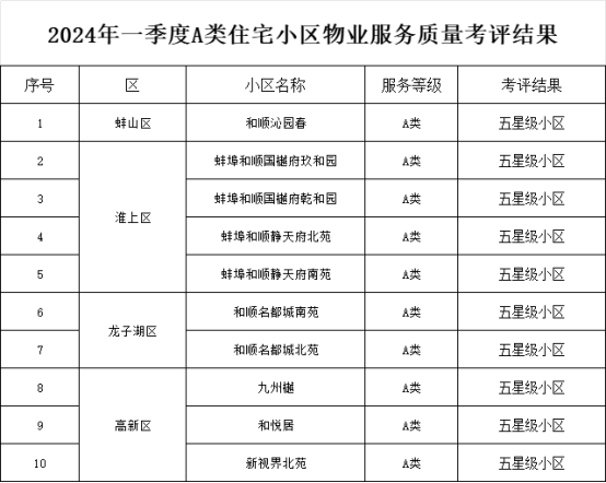 近日,由蚌埠市住建局、相關(guān)物業(yè)行業(yè)專(zhuān)家組成的考評小組,對蚌埠市住宅物業(yè)開(kāi)展了2024年一季度服務(wù)質(zhì)量考評工作。在蚌山區、淮上區、龍子湖區、高新區質(zhì)量考評中,安徽建工新時(shí)代物業(yè)管理有限公司A類(lèi)(服務(wù)等級)住宅項目全部榮獲五星級小區榮譽(yù)稱(chēng)號,在蚌埠市場(chǎng)穩扎第一方陣。