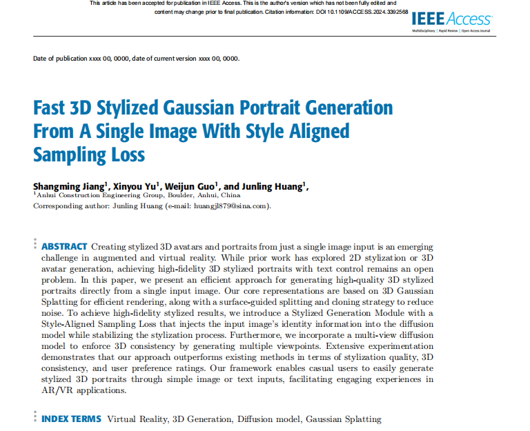近日,安徽建科總承包分院撰寫(xiě)的《從單個(gè)圖像快速生成具有樣式對齊采樣損失的3D風(fēng)格化高斯肖像》SCI論文通過(guò)審核,并且在最新一期的IEEE Access期刊上發(fā)表,出版日期為2024年4月23日。