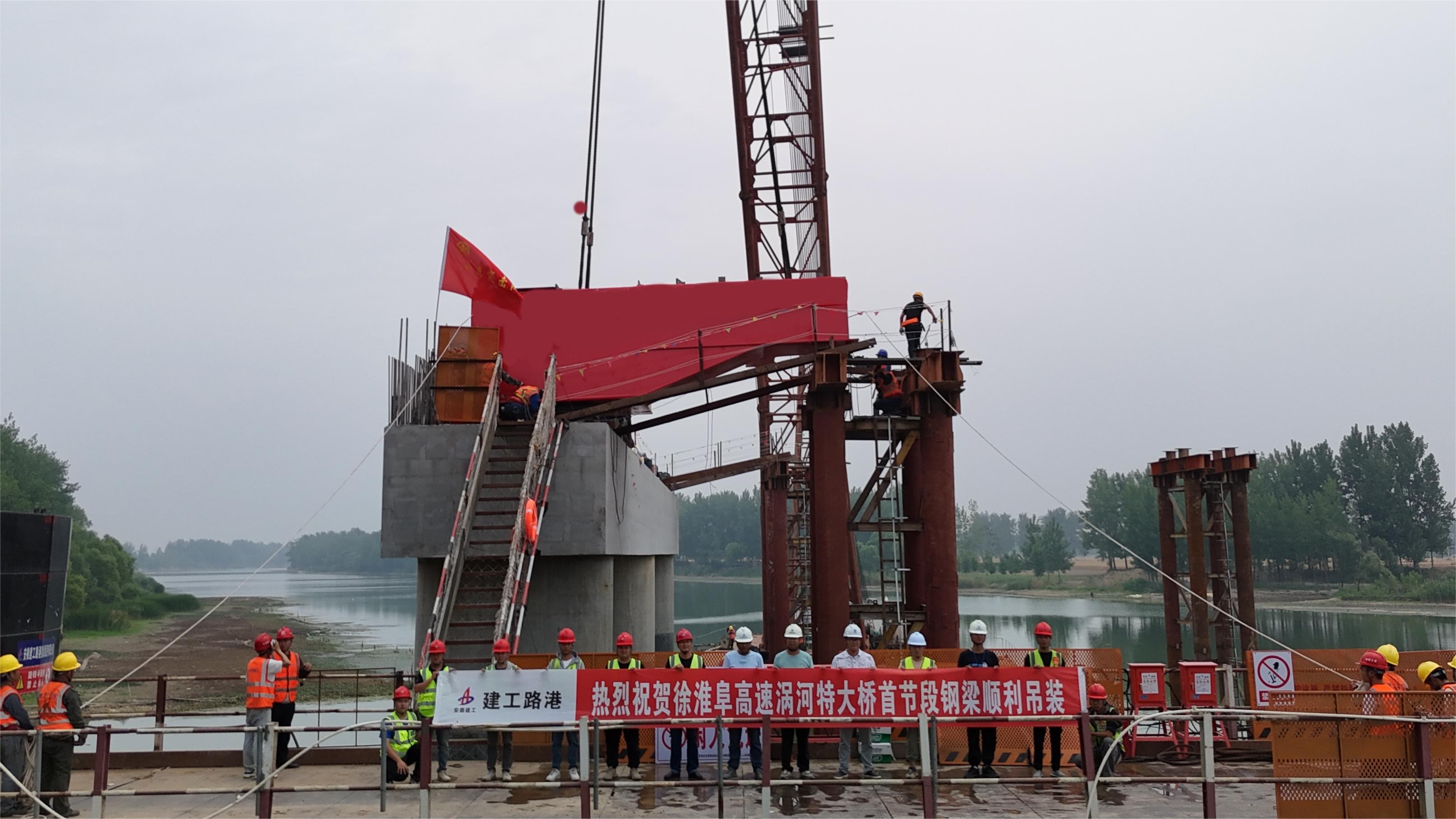 5月26日上午,建工路港徐淮阜高速亳州段路基03標渦河特大橋施工現場(chǎng)人聲鼎沸,隨著(zhù)浮吊緩緩升起,到平穩落下,渦河特大橋首節段鋼箱梁順利完成吊裝。