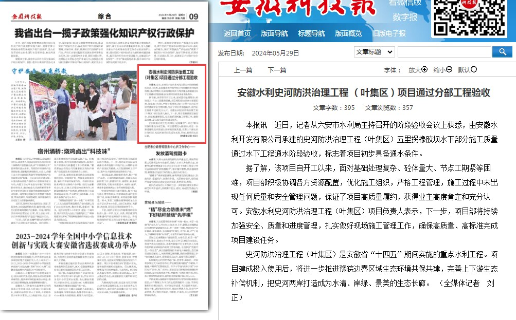 近日,安徽水利承建的史河防洪治理工程(葉集區)項目順利通過(guò)水下工程通水階段驗收,得到業(yè)主高度認可,受到安徽科技報、美麗安徽欄目關(guān)注報道。