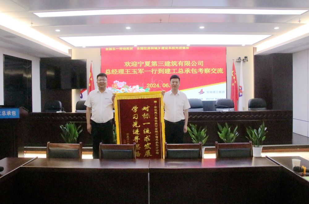 寧夏第三建筑有限公司一行參觀(guān)安徽建工集團文化展廳,向建工總承包贈送“學(xué)習先進(jìn)尋思路 對標一流謀發(fā)展”錦旗。雙方對口部門(mén)圍繞企業(yè)運行、項目管理、內控治理、人才培養等深入交流,并到安徽建工合肥新橋國際機場(chǎng)T2航站樓、淮南壽縣一中、長(cháng)豐縣崗集鎮金明花園等項目實(shí)地觀(guān)摩。