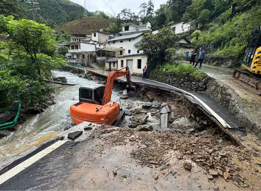 皖南分公司共組織搶險救援人員20人,臨時(shí)調配三臺挖機、兩輛皮卡、20把鐵鍬和一臺15千瓦的發(fā)電機。經(jīng)過(guò)與呈陽(yáng)村相關(guān)負責人溝通后,確定現場(chǎng)應急搶險工作分為兩部分,一是河邊鄉道山體滑坡的碎石清理;二是河堤道路坍塌的搶修。分公司應急搶險救援人員迅速進(jìn)行分工,在施工路段設置警示標識,將人員與機械調配到位,對塌方路段進(jìn)行清理。