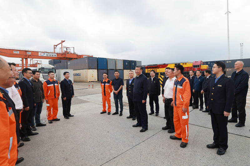 隨后,習近平來(lái)到重慶鐵路集裝箱中心站,聽(tīng)取貨物集散、運輸路徑、運營(yíng)成本和效益等介紹,同貨車(chē)司機、列車(chē)司機、裝卸工人、場(chǎng)站管理人員等親切交流,詢(xún)問(wèn)他們的工作強度、勞動(dòng)保護、節假日休息和收入情況。習近平說(shuō),大家在物流一線(xiàn),也是在對外開(kāi)放一線(xiàn),通過(guò)你們的辛勤勞動(dòng),很多商品跨越山海、走向世界,你們的工作很有意義。推動(dòng)西部大開(kāi)放、促進(jìn)西部大開(kāi)發(fā),物流很重要,大家要繼續努力,不斷創(chuàng )造新的業(yè)績(jì),作出新的貢獻。