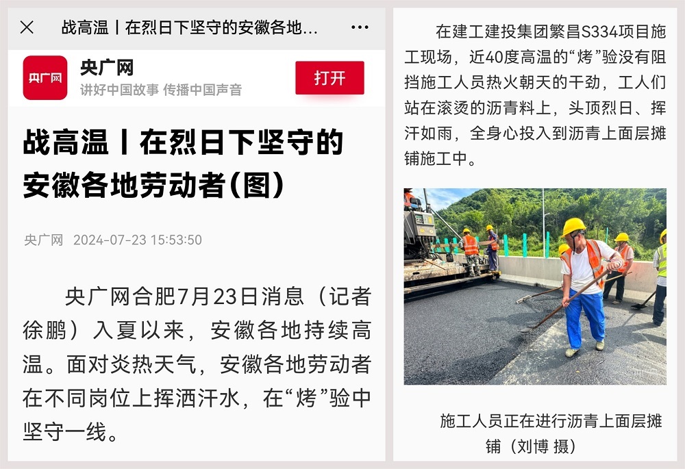 報道中指出:在建工建投集團繁昌S334項目施工現場(chǎng),近40度高溫的“烤”驗沒(méi)有阻擋施工人員熱火朝天的干勁,工人們站在滾燙的瀝青料上,頭頂烈日、揮汗如雨,全身心投入到瀝青上面層攤鋪施工中。