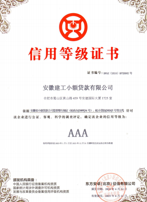 建工小貸連續八年榮膺安徽省小貸行業(yè)最高AAA信用評級