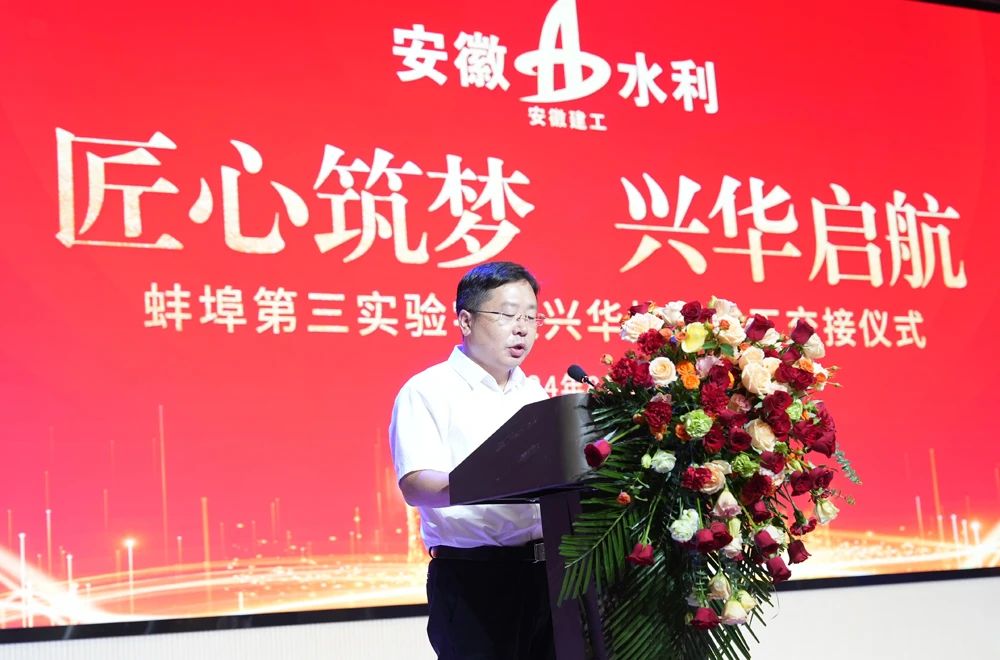8月20日上午,安徽水利承建的蚌埠自貿區山香學(xué)校項目交付儀式正式舉行。蚌埠市委教育工委委員、市教育局副局長(cháng)段元麗,蚌埠高新區黨工委副書(shū)記梅荊山,高投集團黨委書(shū)記、董事長(cháng)李徳旺,蚌埠第三實(shí)驗學(xué)校校長(cháng)王強、興華校區負責人馬蓉,安徽水利黨委委員、副總經(jīng)理周?chē)殖鱿桓秲x式。
