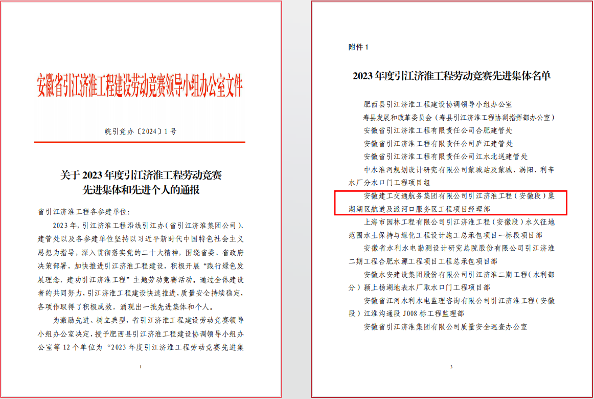 近日,水建分公司引江濟淮工程(安徽段)巢湖湖區航道及派河口服務(wù)區工程項目經(jīng)理部榮獲2023年度引江濟淮工程先進(jìn)集體。
