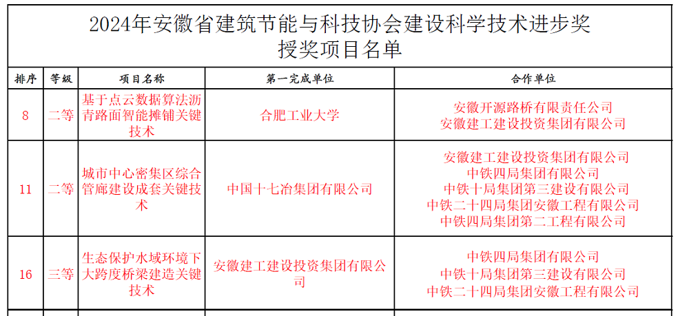 近日,2024年建設科學(xué)技術(shù)進(jìn)步獎結果公布,建工建投3項成果脫穎而出,其中“基于點(diǎn)云數據算法瀝青路面智能攤鋪關(guān)鍵技術(shù)”和“城市中心密集區綜合管廊建設成套關(guān)鍵技術(shù)”2項成果獲二等獎,“生態(tài)保護水域環(huán)境下大跨度橋梁建造關(guān)鍵技術(shù)”成果獲三等獎。