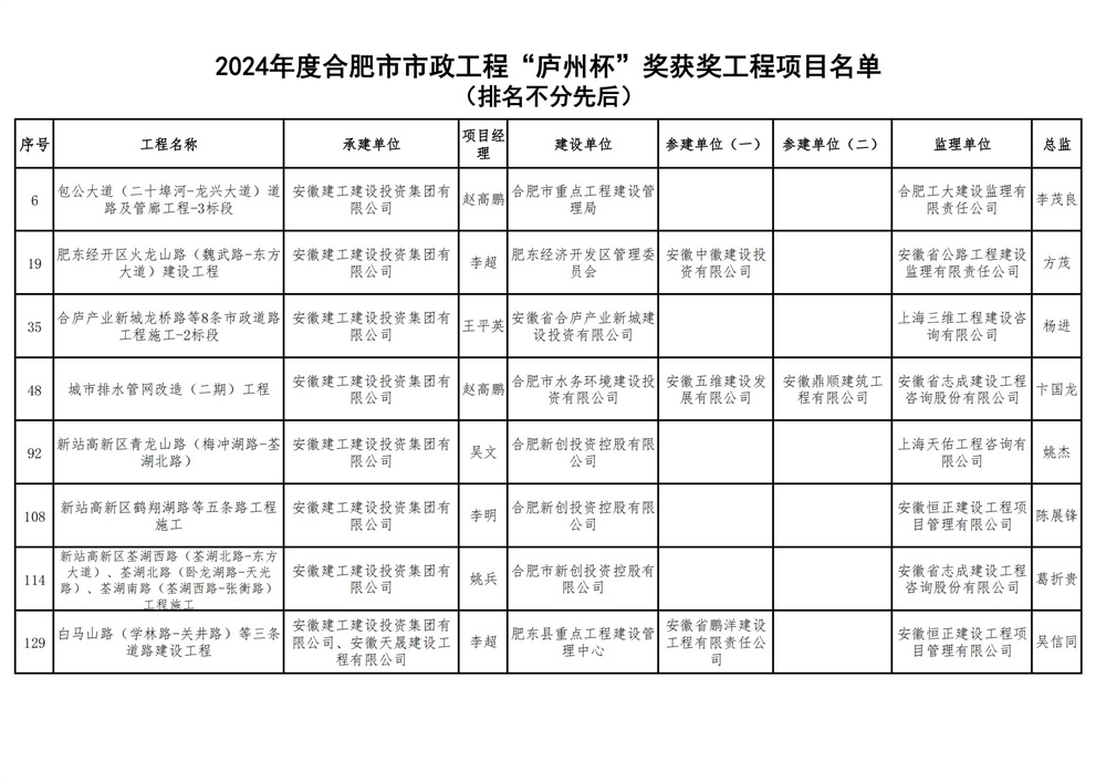 建工建投8項工程榮獲2024年度合肥市市政工程“廬州杯”獎!