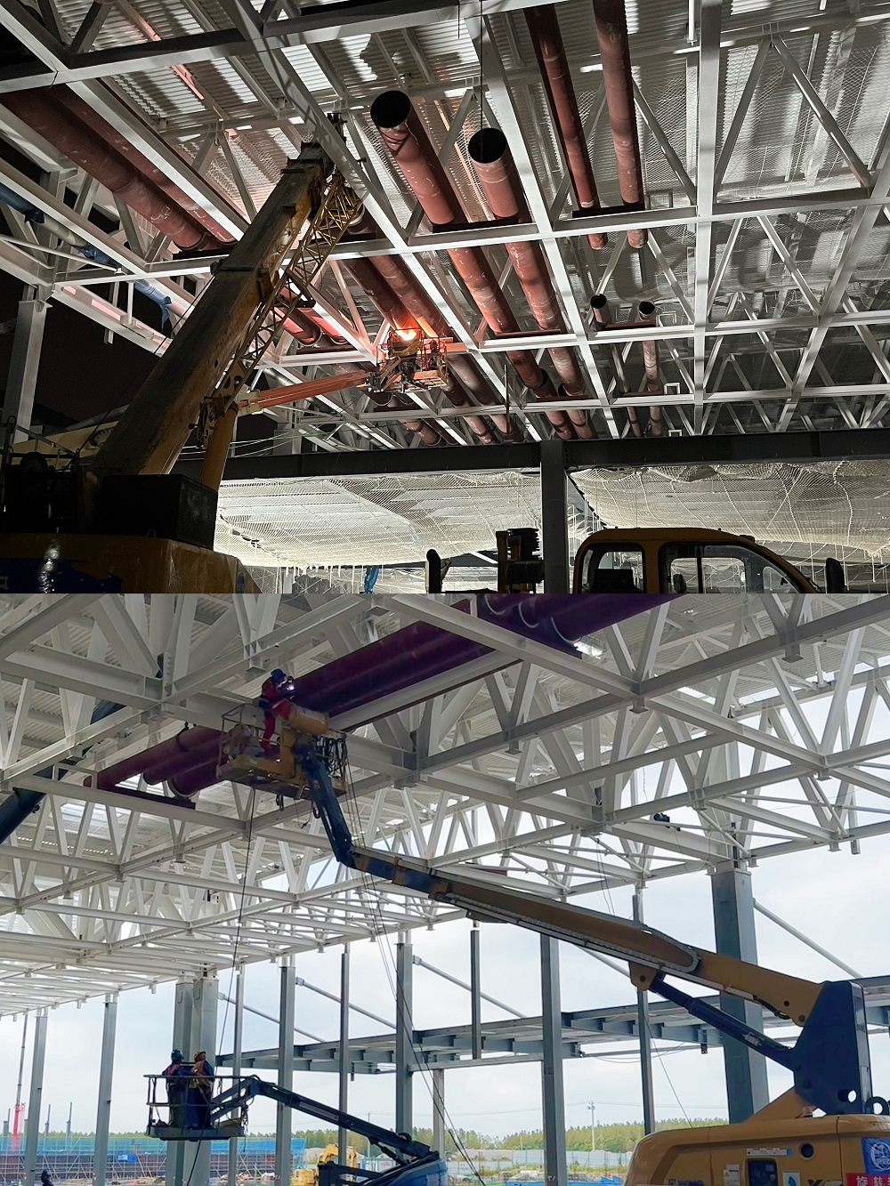 該項目本階段正在進(jìn)行各車(chē)間直徑DN700、DN800的空調冷凍水管道吊裝搶工。為了能早日完成空調冷凍水管道吊裝的工程節點(diǎn)目標,項目管理人員以工期進(jìn)度為主線(xiàn),多次召開(kāi)技術(shù)商討會(huì ),合理優(yōu)化吊裝施工方案,全體員工實(shí)行24小時(shí)輪班工作制,夜晚輪流值班,晝夜奮戰、奮勇?tīng)幭?,發(fā)起項目加速建設的“最強攻勢”。