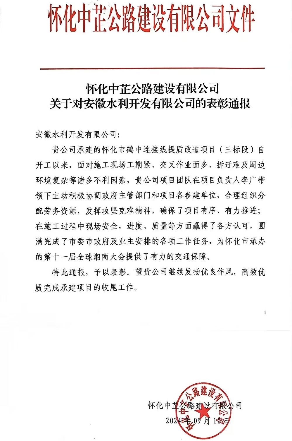近日,安徽水利承建的鶴中連接線(xiàn)提質(zhì)改造(三標段)項目和滁州南揚郡安置小區弱電智能化工程項目榮獲業(yè)主單位表彰。