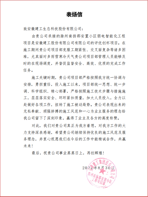 信中對公司參建的滁州南揚郡安置小區弱電智能化工程保質(zhì)保量完成各項施工任務(wù)表示祝賀,對項目部全體人員主動(dòng)克服施工困難,科學(xué)合理組織現場(chǎng)施工,嚴格管控項目建設質(zhì)量安全,充分展示國企擔當給予高度評價(jià)。