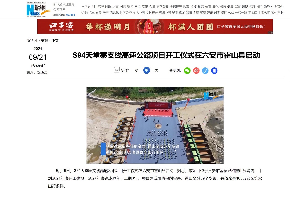 9月19日上午,由安徽建工投資建設的S94和縣至襄陽(yáng)高速公路天堂寨支線(xiàn)項目在六安市霍山縣舉辦開(kāi)工儀式,新華網(wǎng)、人民網(wǎng)、安徽日報、皖西日報等主流媒體紛紛聚焦項目開(kāi)工。