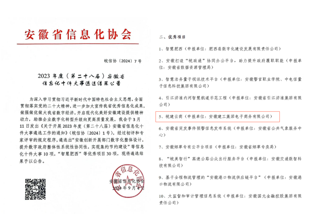 近日,安徽省信息化協(xié)會(huì )公布了2023年度(第二十八屆)安徽省信息化十件大事遴選結果,由建工商貿物流電商公司申報的“皖建云商”經(jīng)過(guò)初評和專(zhuān)家評審,成功入選2023年度安徽省信息化十件大事優(yōu)秀項目。