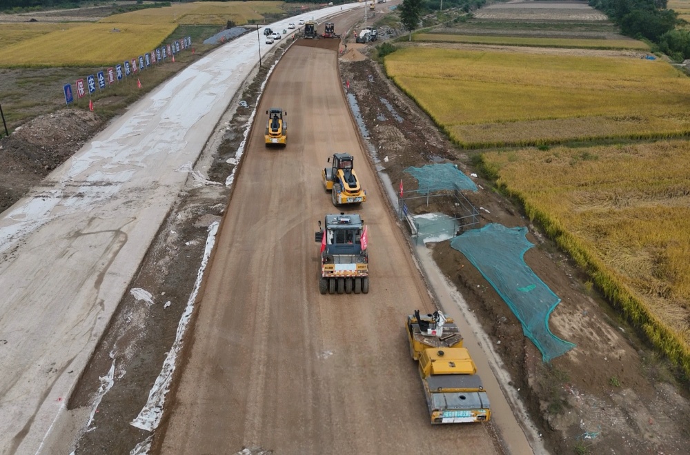 施工現場(chǎng),攤鋪機、壓路機轟鳴不斷,作業(yè)工人緊密配合、標準作業(yè),一派繁忙、有序的施工景象。經(jīng)過(guò)10天緊張有序的施工作業(yè),水穩層攤鋪?lái)樌瓿?,工程進(jìn)度穩步推進(jìn)。