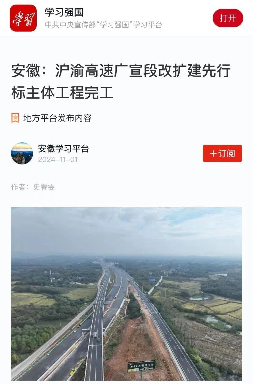 近日,安徽水利承建的滬渝國家高速公路安徽省廣德至宣城段改擴建工程先行開(kāi)工段項目主體工程全部完成,項目進(jìn)展受到中安在線(xiàn)、新安晚報、學(xué)習強國等媒體關(guān)注報道。