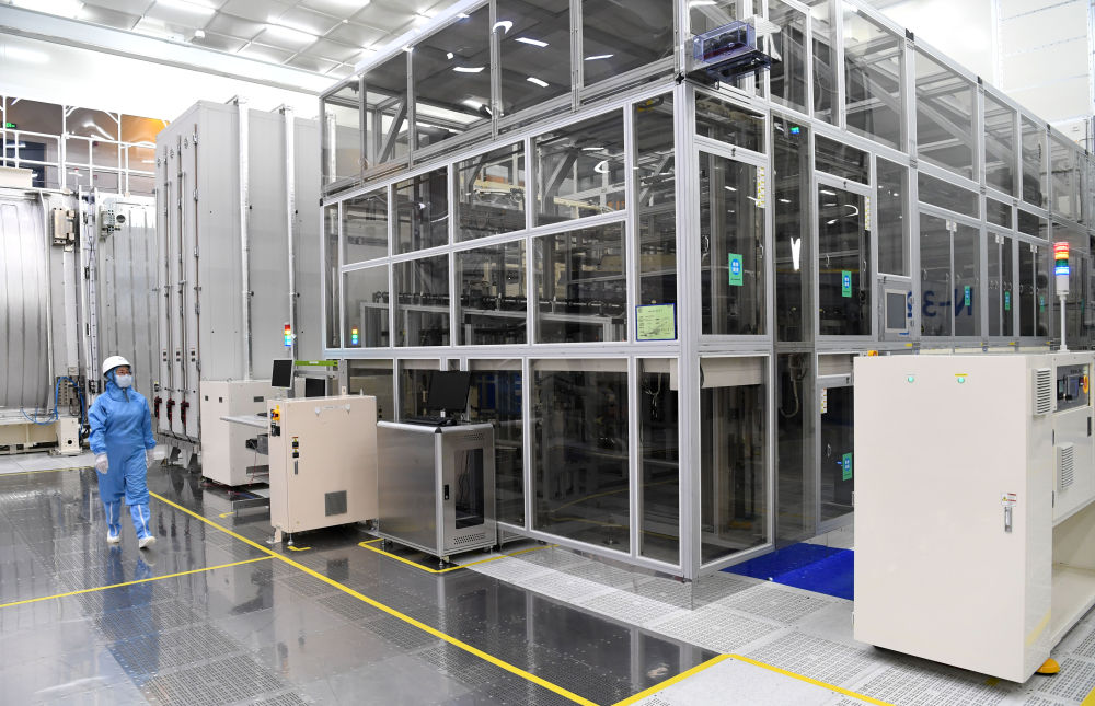 ??2022年7月28日,安徽合肥京東方顯示技術(shù)有限公司的工作人員在10.5代生產(chǎn)線(xiàn)上作業(yè)。