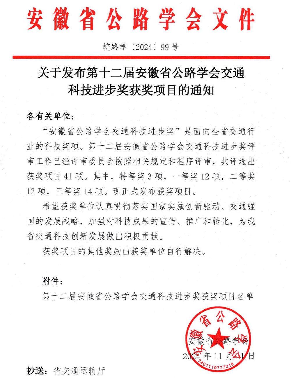 “安徽省公路學(xué)會(huì )交通科技進(jìn)步獎”是面向全省交通行業(yè)的科技獎項。第十二屆交通科技進(jìn)步獎評審工作經(jīng)評審委員會(huì )按照相關(guān)規定和程序評審,共評選出獲獎項目41項。